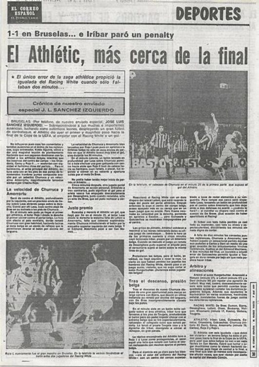 El choque comenzó bien paralos nuestros, con gol de cabeza de Iñaki Churruca en el minuto 26 a falta sacada por Lasa, en una primera parte ampliamente dominada por los bilbainos, merced a su juego vertiginoso y por las alas. Un tanto que los belgas iban a igualar justo a falta de un minuto para el pitido final, tras un infantil error de Goikoetxea; entre medias, una segunda parte con mayor presión local y en la que Iribar llegó a detener un injusto penalti que le pitaron a él mismo –un árbitro suizo muy casero–, siendo tanto él como el portero De Bree los artífices de que el marcador no fuera más bollante. Los leones se traían un buen resultado para la vuelta, pero lamentándose porque habían tenido el triunfo en sus manos. Un soberbio Churruca, la velocidad de Amorrortu y la proyección de Txetxu Rojo fueron insuficientes para más. Los belgas satisfechos porque lo veían todo perdido, los vascos con una sensación agridulce de no haber rematado la faena en un estadio que durante muchos momentos pareció San Mamés.