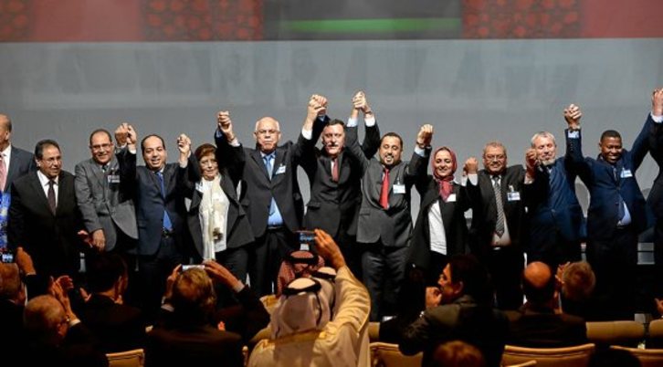 Tras 14 meses de tensas negociaciones, los representantes del Congreso de los Diputados en Tobruk (reconocido por Occidente), Mohamed Chuaib, y del Congreso Nacional General (CNG), el «parlamento rebelde» de Trípoli, Salah Majzum, suscribieron el acuerdo de paz promovido por la ONU en presencia de representantes de la sociedad civil, los ayuntamientos y los partidos políticos libios. La ceremonia, que terminó con los participantes libios coreando el nombre de su país y entonando el himno nacional, contó con la destacada presencia de los ministros de Exteriores del Estado español, Italia, Turquía, Marruecos, Túnez y Qatar, además del representante de la ONU para Libia, Martin Kobler, que en poco más de un mes en el cargo parecía haber deshecho los principales «nudos» del acuerdo.