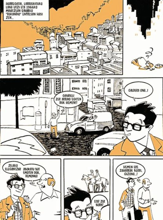 Tinta beltza eta laranja kolorea. Horiek dira Adur Larreak baliatu dituen tresnak Gabriel Aresti bezalako pertsonaia baten bizitza kontatzeko. «Hiru dimentsioak eta horrelakoak beste baterako utzi ditut», azaldu digu txantxetan egileak. Lanean hasi eta berehala konturatu zen komikia izan zitekeela baliabide erraz eta eraginkorra Aresti ezagutzeko. Pertsonaren bila eta ez pertsonaiaren bila aritu delako etengabe.