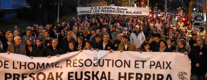 La grave situación de Lorentxa Guimon, encarcelada en la prisión de Renne,s fue una de las protagonistas de la protesta de ayer. Tras la banderola principal, una específica rezaba en francés: «SOS Lorentxa Guimon. Liberad a los prisioneros enfermos».