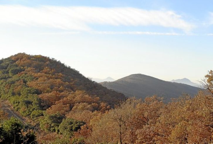 Seguiremos por la derecha por otra pista ganando altura, al tiempo que entraremos en contacto con el bosque tipo mediterráneo colonizado por la coscoja, carrasca, encina y quejigo más arriba el roble pubescente. Una vez en el lomo del cordal, donde la pista se ramifica hacia el oeste y el este, estaremos en un rellano donde hay un cartel “coto de caza nº 18” y muga de Urries con Undue-Pintano. Sin posibilidades de vista, lo mejor es continuar diez minutos por la pista de la derecha hasta alcanzar un alto coronado por una torre de comunicaciones (1004 m.). Aquí, junto un vértice geodésico podremos disfrutar de una amplia panorámica sobre el cercano Pirineo de Jacetania, entre los valles de Anso y Canfranc.