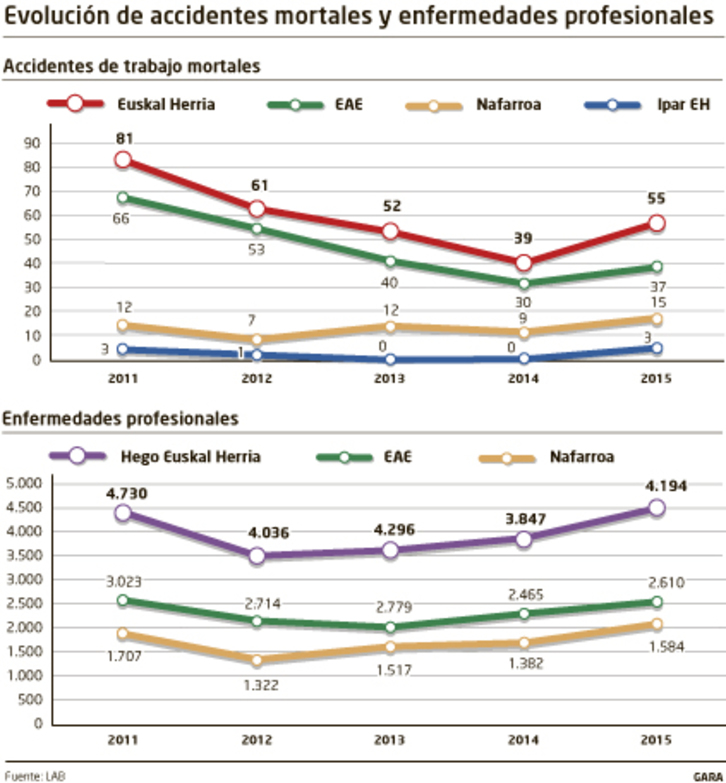 De manera resumida, durante 2015 los accidentes de trabajo han aumentado un 8,7%. Cada día se producen 267 accidentes de trabajo o, lo que es lo mismo, cada cinco minutos se produce un accidente, de los cuales 164 son sin baja y 102 generan una incapacidad superior a un día. Cada seis días se produce un accidente mortal. Los responsables de LAB calificaron todos estos datos como «preocupantes».
