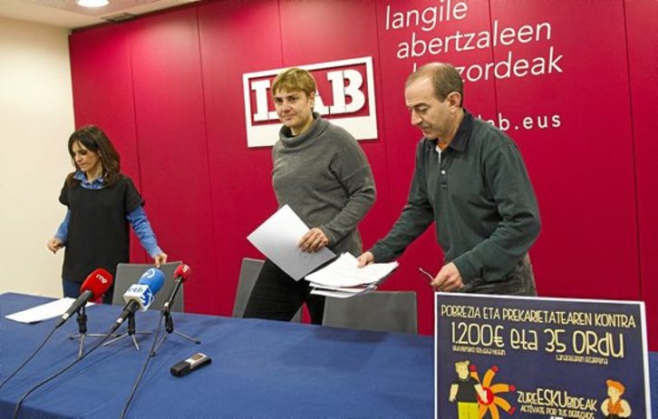 “Lanaren eta bizitzaren prekarizazioaren aurka 1.200 euroko gutxieneko soldata” izeneko txostena aurkeztu zuen atzo LABek. Aldarrikapena bideragarria dela nabarmendu zuen eta zuzenean eskatu zien Iruñeko eta Lakuako exekutiboei aldarrikapenarekin bat egin eta gauzatu dadin pausoak emateko.