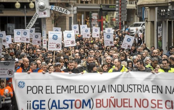 La protesta estuvo encabezada por una pancarta en la que se leía “Por el empleo y la industria en Navarra. ¡GE (Alstom) Buñuel no se cierra!”. En el grueso de la marcha pudieron verse otras dos pancartas, una de ellas contra los despidos en la plantilla del mantenimiento de parques y la otra de los trabajadores de TRW de Landaben, pendientes de un expediente de rescisión que podría afectar a 250 de los 620 trabajadores de la planta.