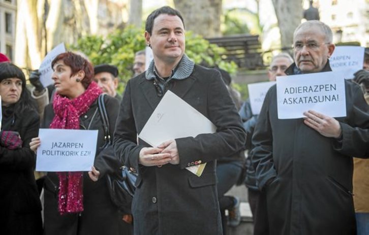 El militante independentista recordó que «es la tercera vez en poco tiempo» que acude al TSJPV «por un delito de opinión». «No es casualidad que me haya tocado a mí porque entiendo –apuntó– que ello obedece a que soy representante de Sortu». Ayer, integrantes de su Consejo Nacional se concentraron para solidarizarse con él y reivindicar la libertad de expresión, al tiempo que denunciaron los juicios políticos.