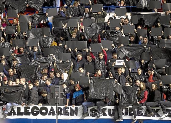 En realidad, en el folleto mencionado se pedía a los aficionados que ocupaban esas localidades que se pusiesen las bolsas negras a modo de peto o elevasen una cartulina del mismo color, a la par que mantenerse en silencio antes del partido para denunciar la «represión y censura que vivimos en Graderío Sur, además de la última razzia policial contra Indar Gorri».