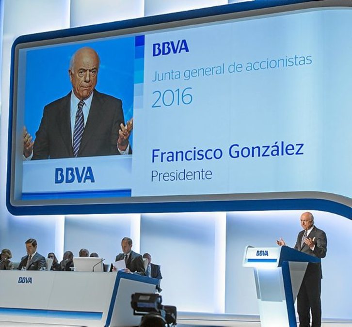 Francisco González fue reelegido ayer presidente del BBVA, previsiblemente por última vez, hasta marzo de 2019, durante la Junta de Accionistas que se llevó a cabo en el Palacio Euskalduna de Bilbo. En su nombramiento planeó la denuncia, dentro y fuera del recinto bilbaino, de un grupo de activistas que informó de que la entidad bancaria financia a ocho empresas fabricantes de armas nucleares y a siete empresas de armas españolas más importantes.