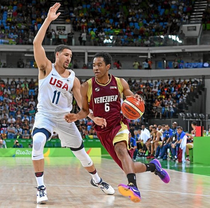 Venezuelako saskibaloi selekzioak astelehen gauean jokatu zuen Ameriketako Estatu Batuen kontra. Espero bezala, iparramerikarrek 113-69 irabazi zuten, baina venezuelarren artean John Cox –irudian– izan zen saskiratzaile nagusia, istorio xelebrea duen jokalaria. Izan ere, Cox Kobe Bryanten lehengusua da. John Chubby Coxek, gaur egungo jokalariaren aitak, Caracasen amaitu zuen bere ibilbidea, CBA Ligan –bigarren mailako lehiaketa– hainbat urtez jokatu eta NBAn ere zazpi neurketa jokatu ostean. Chubbyren emaztea, Victoria, Kobe Bryanten amaren (Pam) ahizpa da. Los Angeles Lakers taldeko izarra aurten erretiratu da, eta Venezuelak 1992az geroztik ez zuen lortzen Jokoetarako sailkatzea. Hala bada, lehengusuak elkarren aurka jokatu ezinik gelditu dira. «Zorte txarra», azaldu zuen Coxek. Andrej ISAKOVIC | AFP PHOTO