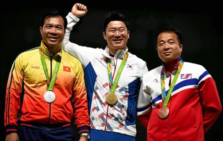 El surcoreano Jin Jongoh, campeón en Beijing 2008 y Londres 2012, dominó la ronda final y se llevó el oro. Con 193.7 puntos, superó al vietnamita Hoang Xuan Vinh –vencedor el día 6 en la prueba de 10 metros–, plata con 191.3, y al norcoreano Kim Song Guk, bronce con 172.8.