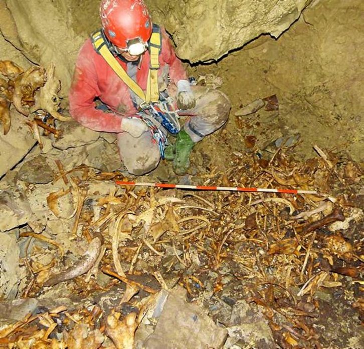 Ocultos entre huesos de animales a más de 50 metros de profundidad, espeleólogos y miembros de Aranzadi han encontrado en Erro restos humanos junto a una albarca de caucho que podrían ser de un desaparecido del 36.