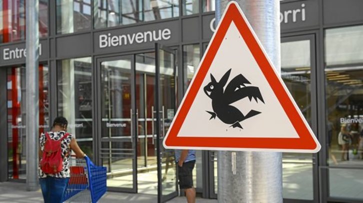 En la entrada al centro comercial BAB2 de Angelu se puede ver una señal de peligro con un Pokémon. Da la impresión de alertar sobre las criaturas fantásticas de los dibujos animados y el videojuego. Pero el caso es que el peligro no proviene de los Pikachus de turno sino de sus cazadores, personas que con los ojos fijos en la pantalla de su smartphone y la atención centrada en el “Pokémon Go” ya se han llevado por delante a varios clientes.Isabelle MIQUELESTORENA