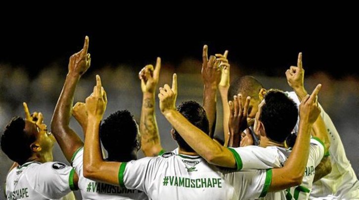 Solo 99 días después de la tragedia aérea en la que fallecieron 19 jugadores de la primera plantilla y el entrenador Caio Junior, además de otras 51 personas, el Chapecoense debutó en la Copa Libertadores en Maracaibo frente al Zulia venezolano: y los brasileños, para completar una jornada ya emotiva de por sí, vencieron 1-2 el partido correspondiente al grupo 7 de la competición. En la imagen, futbolistas del Chapecoense celebran un gol.Juan BARRETO | AFP PHOTO