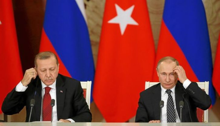 Los presidentes de Rusia, Vladimir Putin, y de Turquía, Recep Tayyip Erdogan, instaron ayer a preservar la integridad territorial de Siria como condición para el arreglo del conflicto en el país árabe. «El principio de la integridad territorial de los estados debe ser respetado. En ese sentido, el restablecimiento de la integridad territorial de Siria es una condición indispensable para el arreglo de la crisis», afirmó en un mensaje en el que coincidió Erdogan, para el que supone un rechazo a la creación de una entidad autónoma kurda en el norte de Siria, contra la que Ankara ha puesto en marcha su intervención militar en territorio sirio. Ambos dieron por restablecidas por completo las relaciones bilaterales y Putin calificó a Turquía de «socio de suma importancia» tanto en el plano político, como económico y militar. El presidente ruso aseguró que gracias a la coordinación de las acciones militares de Rusia, Turquía e Irán «la tregua en Siria se respeta en líneas generales» y «el nivel de violencia se ha reducido notablemente». Insistió en que se volverá a las «negociaciones directas y concretas» en Astaná, donde se celebrará una tercera ronda la próxima semana tras la falta de progresos en Ginebra. Además, destacó que acordó con Erdogan cooperar «más activamente en la lucha contra el terrorismo», en particular contra el ISIS, tanto en el plano militar, como de Inteligencia.GARA