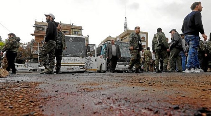 Siriako telebista publikoak eskainitako irudietan suntsitutako autobus zuriak ikus zitezkeen. Beste ibilgailu batzuk erabat kiskalita zeuden. Lurrean, sakabanatuta, oinetakoak, betaurrekoak, gurpil-aulkiak... Eta bazter guztietan, odol arrastoak.