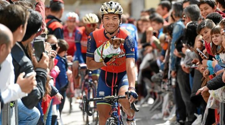 El japonés Yukiya Arashiro, de 32 años, se caracteriza por ser combativo dentro del asfalto y uno de los más amistosos dentro del pelotón. El corredor, actualmente en el Bahrain-Merida, tiene por costumbre pasear con su perro Corin antes de cada carrera, como se ha visto en la Volta a Catalunya, lo que atrae la curiosidad de los seguidores. El sábado quedó eliminado con otros 46 ciclistas al llegar fuera de control, pero ni eso le quita la sonrisa a Arashiro.Josep LAGO | AFP
