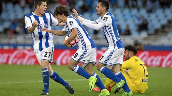 Eusebio sorprendió con su alineación no tanto por el debut de Igor Zubeldia para jugar en la posición de Zurutuza, algo que se podía esperar con la convocatoria, como con la suplencia de Mikel Oyarzabal, al decantarse por alinear a Canales por la derecha en lugar de Vela y a Juanmi por la izquierda en la vuelta a la alineación de Willian José.