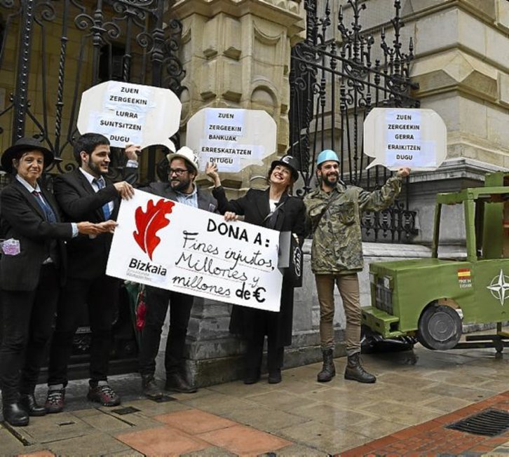 Miembros de la Plataforma por la Objeción Fiscal de Euskadi, formada por KEM-MOC Bilbo, Setem Hego Haizea, Ekologistak Martxan, Kakitzat, ESK, Mundubat, Mugarik Gabe y la Asociación vasca de apoyo a Fiare, se concentraron ayer junto al palacio de la Diputación Foral de Bizkaia para denunciar el «despilfarro bochornoso del gasto público en militarismo».