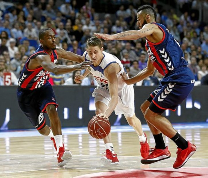 Se fue cerrando la canasta en el segundo cuarto. La buena noticia era que las pocas canastas llegaban en forma de triple del Baskonia, obra de Beaubois y Tillie; la mala era que los gasteiztarras se cargaban de faltas. A pesar de todo, los de Sito Alonso se las iban componiendo para mantenerse siempre en cabeza. Un triple de Larkin por aquí, un «dos más uno» de Beaubois por allá, mientras que Doncic acaparaba los ataques merengues sin hacer jugar a sus compañeros.