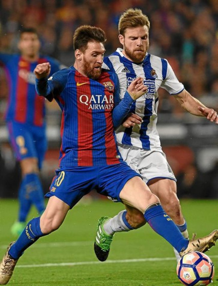 En ese primer tiempo a la Real le perjudicó además la vuelta de Luis Enrique a la forma de juego que mejor dominan sus futbolistas. Los azulgranas sobre todo crearon problemas con los jugadores de las bandas porque Messi y Alcácer buscaban posiciones centrales y hacían perder el sitio a Zaldua y Yuri, y por sus bandas entraban Sergi Roberto, especialmente, y Jordi Alba. Y cuando el balón llegaba a Messi encontraba los espacios con su visión privilegiada. Porque no solo marcó dos goles y dio una asistencia en el primer tiempo, también dos pases al espacio que generaron opciones claras.