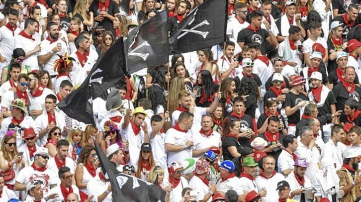 El pirata Juan José Padilla regresó ayer a la Monumental iruindarra y, de nuevo, fue recibido con banderas negras con calaveras y tibias en el Tendido Sol. El torero fetiche de los jaraneros fue el encargado de abrir la corrida, pero no tuvo buen día. No sería extraño verle hoy correr el encierro.