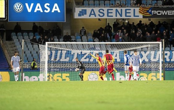 Eusebio presentó nueve cambios con respecto al equipo que empató el domingo contra el Las Palmas –solo repitieron Diego Llorente, baja por sanción el sábado ante el Atlético– y Xabi Prieto, con la vuelta de Carlos Martínez casi un año después. Pero la Real no quedó eliminada porque jugaron los menos habituales. Con esa alineación ganaba 2-0 al descanso y era muy superior a su rival. Tampoco se puede buscar la razón de la debacle a la sustitución de Xabi Prieto poco antes del primer gol catalán. Ya es triste que tenga que ser alineado el jugador más veterano del equipo en los dos partidos de Copa ante los problemas para sustituirle...