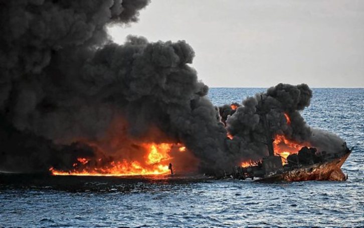 El Sanchi, con 136.000 toneladas de crudo de baja intensidad, colisionó el 6 de enero con un carguero. Sus 32 tripulantes murieron y el buque ardió hasta que se hundió el 14 de enero.