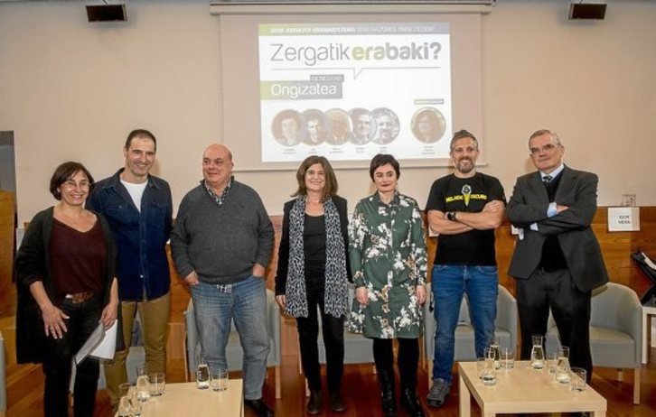 LAS PENSIONES, EL SISTEMA BANCARIO, EL DE PROTECCIÓN SOCIAL Y LA INDUSTRIA TIENEN FUTURO SI A LA CIUDADANÍA SE LE DA LA OPORTUNIDAD DE EJERCER SU DERECHO A DECIDIR. UNA MESA REDONDA EN BILBO SIRVIÓ PARA OÍR RAZONES POR LAS QUE MERECE LA PENA QUE VASCAS Y VASCOS TENGA LA OPCIÓN DE CONSTRUIR SU PROPIO MODELO.