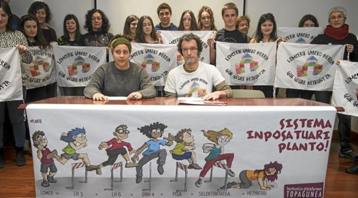 Hezkuntza Plataformen Topaguneak eskoletan bizi duten «egoera larria» jendarteratzeko beharra ikusi du berriro. Atzo Bilbon egindako agerraldian Lakuak zein Nafarroako Gobernuak Lomce edo Heziberri bete-betean aplikatzen jarraitzen dutela kritikatu zuen. Bi hezkuntza sailek «ebaluazio sistema propio eta hezitzailearen norabidean pausoak emateari uko» egin eta «kanpo interesei erantzuten dien ebaluazio-kalifikazio sistema aplikatzea» erabaki dutela adierazi zuen.