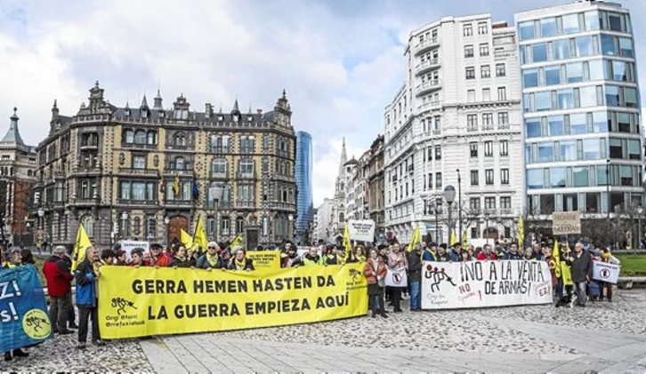 No son los únicos implicados en el envío de material bélico, precisaron desde la plataforma. De ahí la concentración ayer ante la Subdelegación del Gobierno español en la capital vizcaina para apuntar a quienes permiten que las guerras, que generan muerte, destrucción y obligan a la huida de la población en busca de asilo, se alimenten. “Gerra hemen hasten da” (La guerra empieza aquí) o “¡No a la venta de armas!” fueron algunas de las pancartas que se exhibieron, como las populares enseñas con el lema “Gerrarik ez”.