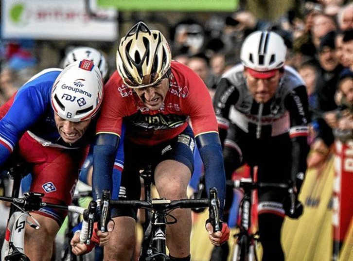 Pero el pelotón, con el trabajo especialmente del Quick-Step y el FDJ, redujo poco a poco la distancia del trío, que vio cómo a 20 kilómetros de meta su ventaja se quedó en 15 segundos y después fue anulada. Entonces, Alexis Vuillermoz (AG2R La Mondiale) intentó despegarse del grupo y abrió un hueco de 10 segundos a falta de los últimos mil metros, pero en una recta de adoquines, a 100 metros de meta, quedó neutralizado para resolver la llegada de una forma tan ajustada que fue necesario revisar las imágenes para confirmar el ganador.