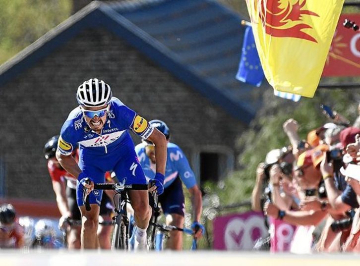 Julian Alaphilippe (Quick Step) se impuso ayer en la Flecha Valona y rompió la racha de cuatro victorias consecutivas de Alejandro Valverde, que se tuvo que conformar con la segunda plaza tras una carrera que se le complicó mucho a su equipo Movistar tras marcharse por delante un grupo con Nibali tras la primera subida al muro de Huy.
