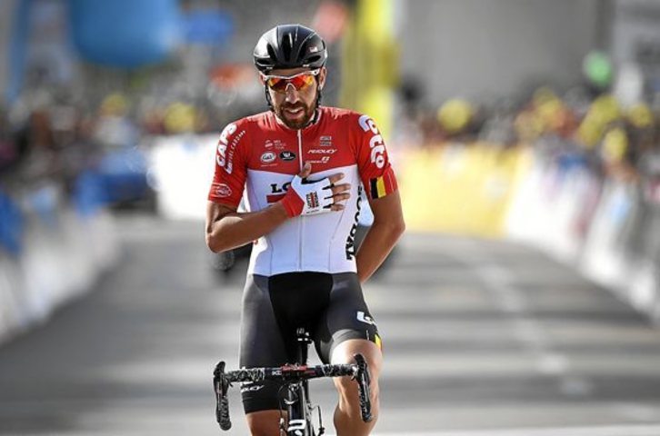 El belga del Lotto Soudal se escapó al comienzo de la etapa y, tras ir dejandodescolgados a sus rivales, se plantó solo en la meta. Hoy, cita en Asturias.