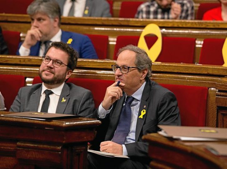 «Hoy me siento muy bien acompañado», arrancó Torra en referencia a sus consellers, tras lo cual trenzó una intervención de poco más de media hora a salto de mata entre objetivos políticos concretos a corto plazo y recordatorios republicanos sobre el mandato del 1-O. El equilibrismo será una constante durante la legislatura catalana.