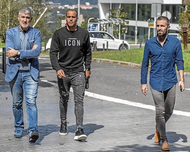Sandro Ramírez llegó ayer a Donostia para pasar reconocimiento médico en la Policlínica, cerrar su incorporación a la Real como cedido hasta junio y posar con el presidente Jokin Aperribay con el número 24 que ha dejado vacante Alberto de la Bella.