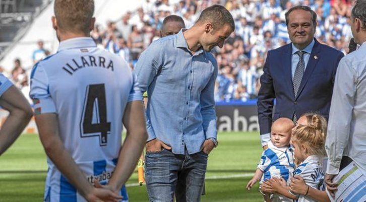 Imanol Agirretxe se llevó la primera ovación del nuevo Anoeta al salir acompañado de su mujer y sus dos hijas para recibir la insignia de oro y brillantes de la mano de Jokin Aperribay con la presencia de Jesús Satrustegi para recordar que ha sido el mejor delantero de la cantera desde el navarro. El usurbildarra trasmitir su agradecimiento solo en euskera a una afición que le recibió con el grito con el que le animó toda su carrera, marcó su último gol con el vuelo correspondiente en el fondo Aitor Zabaleta, muy recordado ayer, que representa el futuro de la Real al llenarse de jóvenes abonados.