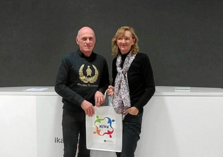 Nafarroako Ikastolen Elkarteak KiVa eskola jazarpenaren aurkako programak emandako lehen emaitzak aurkeztu zituen atzo, Josu Reparaz Nafarroako Ikastolen Elkarteko zuzendariaren eta Irene Lopez-Goñi proiektuaren arduradun pedagogikoaren eskutik.