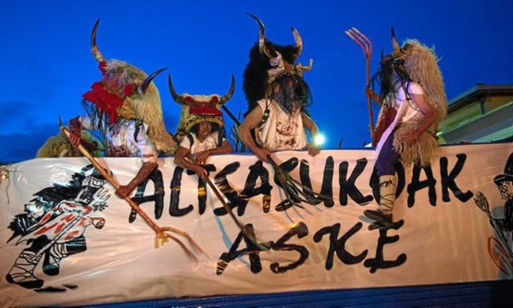 Irudia AFP albiste agentziak zabaldu zuen atzo mundu osora, “Spain-Carnival” izenburupean. Inauterien bukaeran, momotxorroen eskutik zabaldu da oraingoan 2016ko azarotik espetxean segitzen duten gazteak askatzearen aldeko aldarria. Zail izango luke agentziak bere bezeroei goitik behera odoleztatutako piztia hauen jatorriaren berri ematea; are zailagoa, agian, kartzelatze horiek azaltzea.