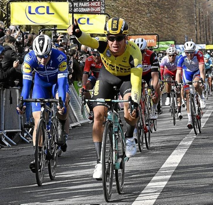 Dylan Groenewegen (Jumbo) ganó ayer la primera etapa de la París Niza con salida y meta en Saint Germain en Laye, que estuvo marcada por los abanicos registrados en los últimos kilómetros, que provocaron que Ion Izagirre llegara en un grupo a 2:42 del resto de favoritos.
