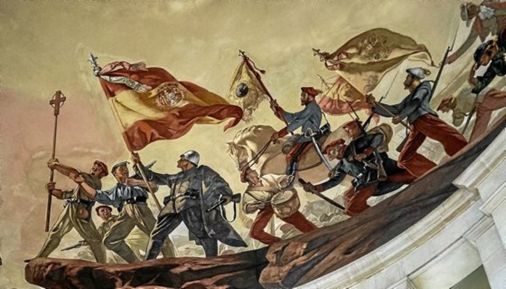 El proceso participativo del Ayuntamiento de Iruñea para decidir el destino del Monumento a los Fueros no está pasando desapercibido precisamente. A las siete propuestas integrales presentadas (una para derribarlo y seis para resignificarlo) se suman ahora 719 aportaciones ciudadanas, 665 de ellas presenciales. No es para menos si se aprecian estas pinturas de la cúpula exaltando la «Cruzada».