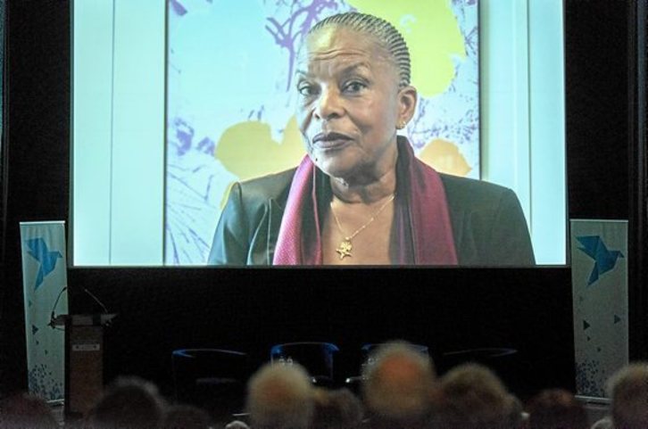 Christiane Taubira, quien fuera ministra de Justicia bajo la presidencia de François Hollande, fue la encargada de dirigir el primer mensaje oficial a los asistentes al encuentro en Bellevue. Lo hizo a través de un vídeo, por encontrarse actualmente «en la ribera sur del Océano Atlantico». Pese a ello, expresó su «total cercanía mental, política y afectiva» con ese que llamó, en distintas ocasiones, «el ejército de bienhechores» que actúa para consolidar la paz en Euskal Herria.