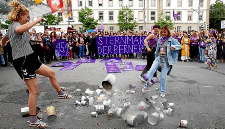 Berna Suitzako hiriburutik iritsi zaizkigun irudiek poza eta indarra transmititzen dute. Lanuzteetara ohituta ez dagoen herrialde horretan, emakumeen greba handitik kasik 30 urtera, kaleak hartu zituzten atzo berriro, soldata arrakala amai dadin. 1991ko ekainaren 14 hartan bezala, greba handi bat egin eta jai giroan mobilizatu ziren. Emakume suitzarrek gizonek baino %20 gutxiago kobratzen dute, batez beste.