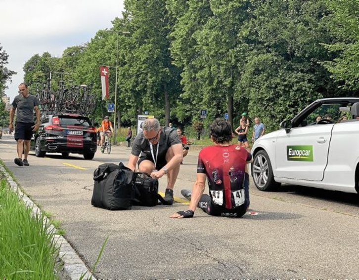 Tras el susto que les dio Egan Bernal al caer en mayo en un entrenamiento y quedarse sin correr el Giro y el mazazo del accidente de Chris Froome, lo del galés parecía ya demasiado. Los minutos con Thomas en el suelo doliéndose del hombro acompañado por los médicos del equipo se hacían interminables. El kazajo Zeits, otro tanto, separados ambos solo por cinco metros. Poco a poco Thomas empezó a mover las articulaciones, lo que a la espera de las últimas pruebas, hace pensar que todo quedará en una fuerte contusión y erosiones en la espalda.