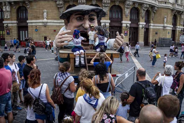 Esa larga hilera se multiplicó cuando la comparsa de gigantes y cabezudos acudió a visitar a su viejo amigo acompañados por cientos de incondicionales. Con cierto retraso sobre la hora prevista, cuatro parejas de gigantes y nueve revoltosos cabezudos iniciaron su primera kalejira con el Museo Vasco como lugar de salida y llegada.