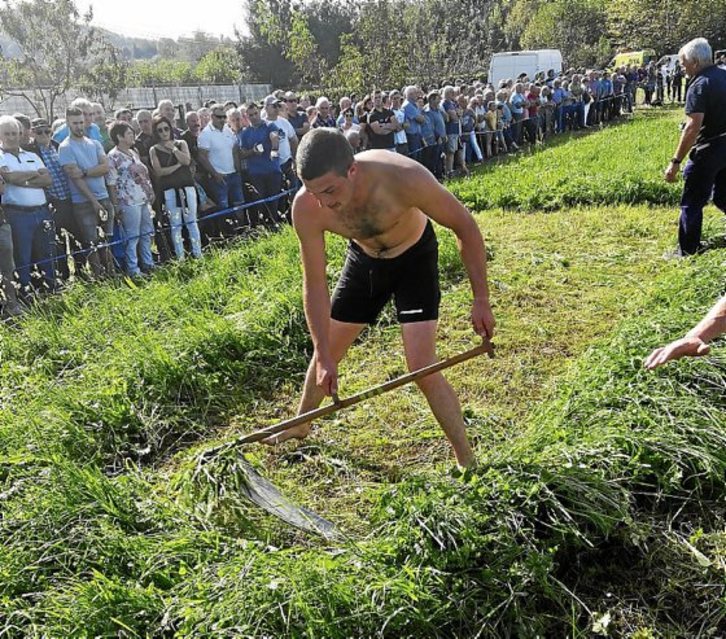 Atzo eguerdian jokatu zen Hernaniko Jauregin oraintsu adostu zen desafioa Jon Larrañaga Larra eta Jokin Urretabizkaiaren artean. Lana, 75 minutuan egin beharrekoa, honako hau: kanaerdiko zortzi pago enbor ebaki eta, jarraian, 75 minutuak agortu arte, ea nork belar kilo gehiago ebaki segan.