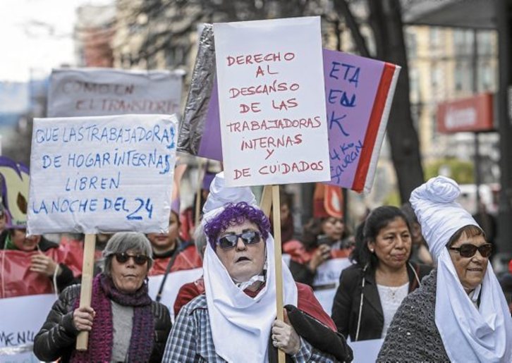 Batez ere, ordaindu gabeko zaintzaz mintzatu gara orain arte; hori gehienetan senitartekoak zaintzeko hartutako denbora izan ohi da. Badago beste sektore bat, zahar etxeez gain –hauek ere ez baitaude herritar guztientzat eskuragarri eta batzuk topera beteta baitaude–, mendeko pertsonak artatzen dituena. Etxeko langileen kolektiboa da. Lan erregimen orokorrak langileen %10 babesten du eta %90ek ez dute prestazioetarako eskubiderik –gaixotasun edo amatasun bajak, kasu–.