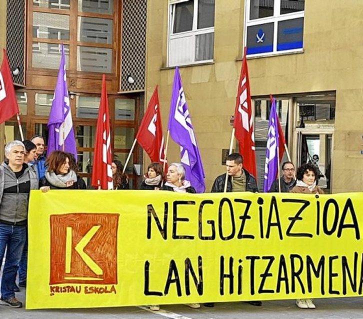 Trabajadoras y trabajadores de centros educativos de iniciativa social de Gipuzkoa se movilizaron ayer ante la sede de Kristau Eskola en Donostia, en una concentración convocada por LAB para denunciar que la patronal ha «suspendido» la negociación del convenio.