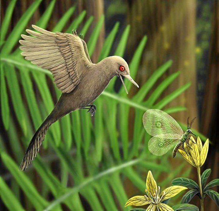 El hallazgo del cráneo de un dinosaurio prehistórico preservado en ámbar en Myanmar saca a la luz a una criatura aviar del tamaño de un colibrí –en la imagen una recreación– que vivió hace 99 millones de años. El fósil, descrito en la revista ‘‘Nature’’, mide solo 1,5 centímetros de largo desde la parte posterior de la cabeza hasta la punta del pico y tiene la anchura aproximada de la uña del pulgar. Los investigadores estiman que el ejemplar de Oculudentavis khaungraae tenía alas con plumas pero, a diferencia del colibrí, sus 40 dientes afilados indican que no se alimentaría con néctar.