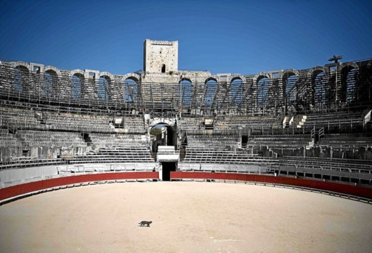 Joan den asteburu luze honetan, ostiralean hasi eta atzora arte, Arlesen (Okzitania) zezen feria egitekoa zen. Baina koronabirusaren pandemiak hura ere hankaz gora bota du eta bertako zezen-plazak argazkiko itxura hau izan du lau egunetan: hutsik, isilik. Hori bai, tartean-tartean, eta den-dena libre zegoela ikusita-edo, animaliaren batek edo bestek harea zapaltzeko adorea agertu du. Banderillak edo ezpata sastatuko zizkion inor ez zegoelako, ziur asko.