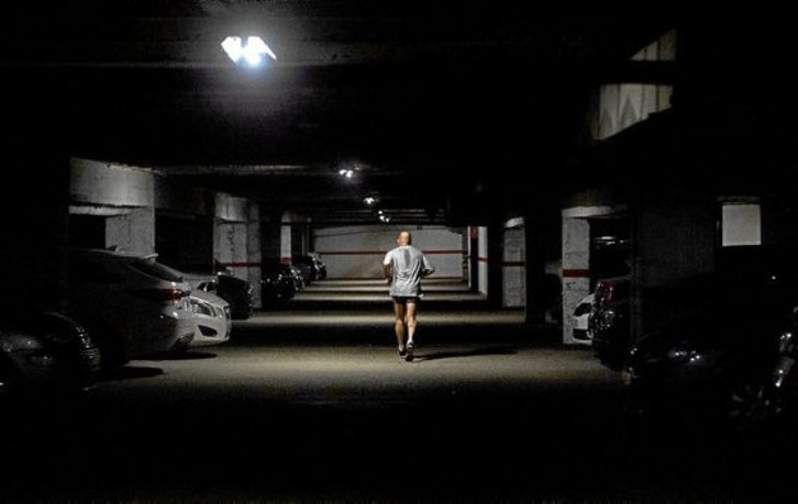 Argazkilariak gizon bat garaje batean korrika egiten harrapatu zuen, herenegun, Vigon. Estatu espainolean berrogeialdia luzatzen ari da eta askok beren beharrei bide emateko irtenbide irudimentsuak aurkitzen dituzte. Preso ugarik egiten duten bezala. Azken batean, konfinamendua Covid-19 pandemiari aurre egiteko beharrezkoa den neurria izanda, ez al gaude, nolabait, preso?