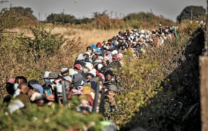 Asteazkenean, milaka lagun izan ziren ordu luzez ilaran Pretoriatik hurbil, maskarak, xaboia eta desinfektatzailea jasotzeko. Gehienak Afrika osotik iritsitako etorkinak ziren, konfinamenduarekin kale gorrian gelditu direnak. Pandemia garaian pobreziak duen aurpegietako bat da, baliabide faltaren ondorioz beren burua arriskuan jarri beharrak eragindakoa.